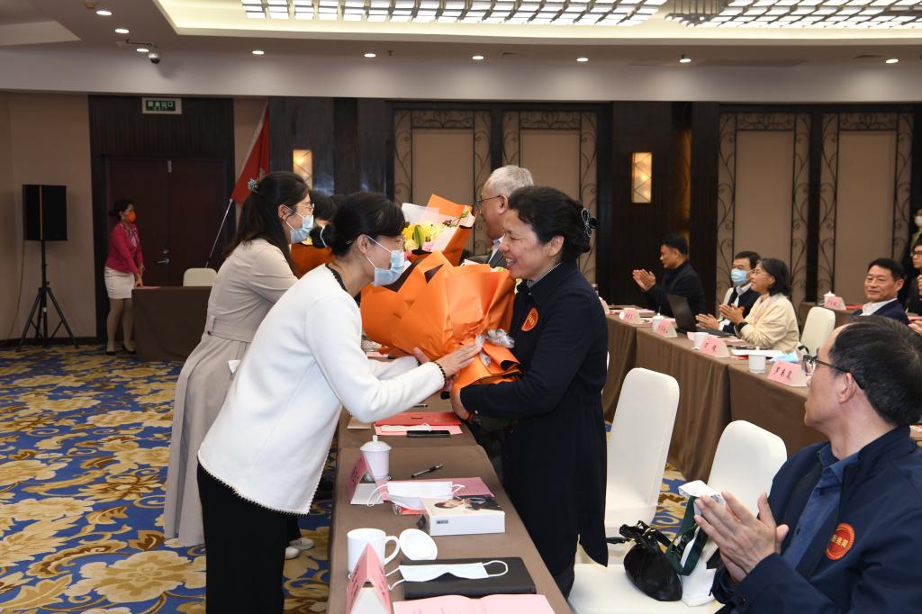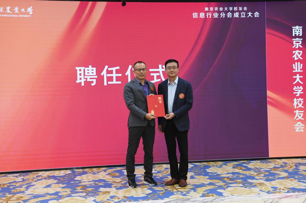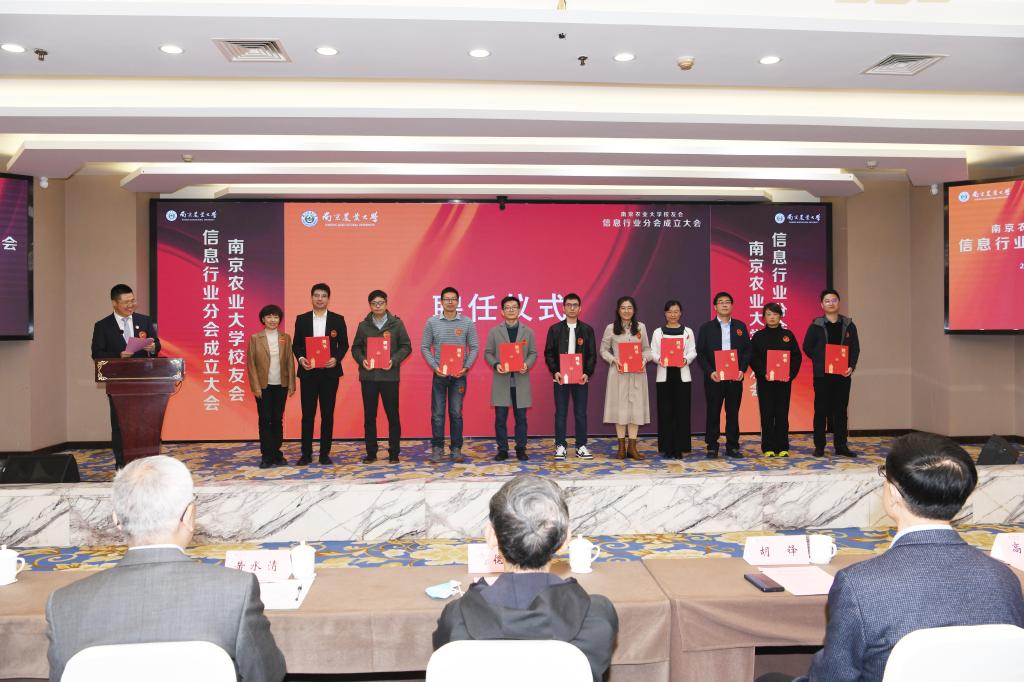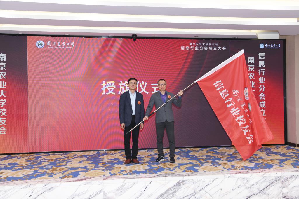 校友总会办公室(教育发展基金会办公室)主任姚科艳为任妮、张长秀、严文政、张小亮等十名理事会成员颁发聘书。胡锋副校长为杨敦华理事长和黄水清荣誉理事长颁发聘书。胡锋副校长为校友会信息行业分会授旗,杨敦华理事长上台领旗。