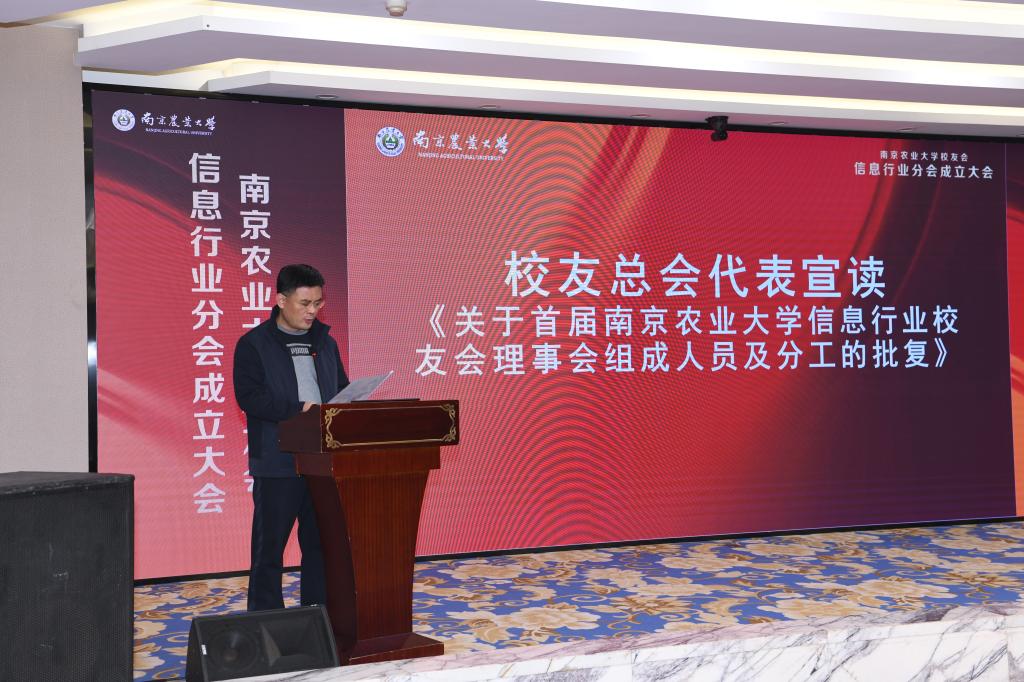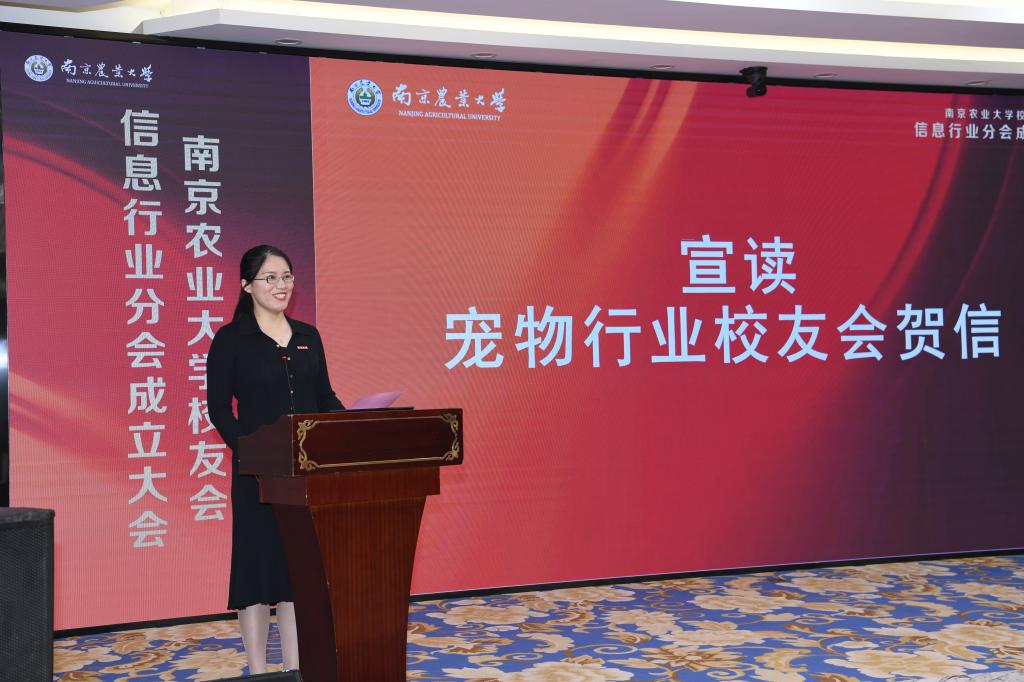 信息系教师代表宗何婵瑞宣读宠物行业校友会贺信。宠物行业校友会在贺信中表达了对信息行业校友分会成立的热烈祝贺,对信息行业校友在行业内的突出建设和重要成就表达充分肯定,并表示愿与信息行业校友分会一同携手,发挥校友会的纽带作用,为校友、母校和社会的发展做出应有的贡献。