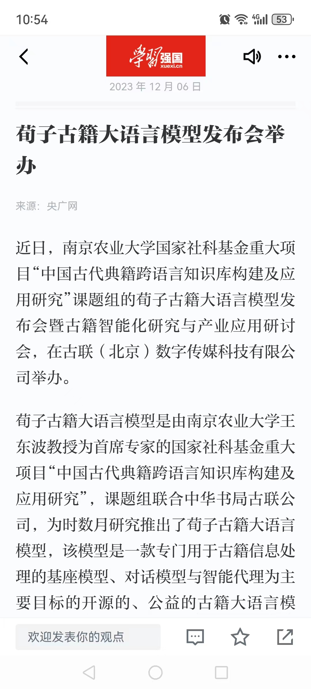 近日,学习强国报道B站 王东波教授团队发布荀子古籍大语言模型。