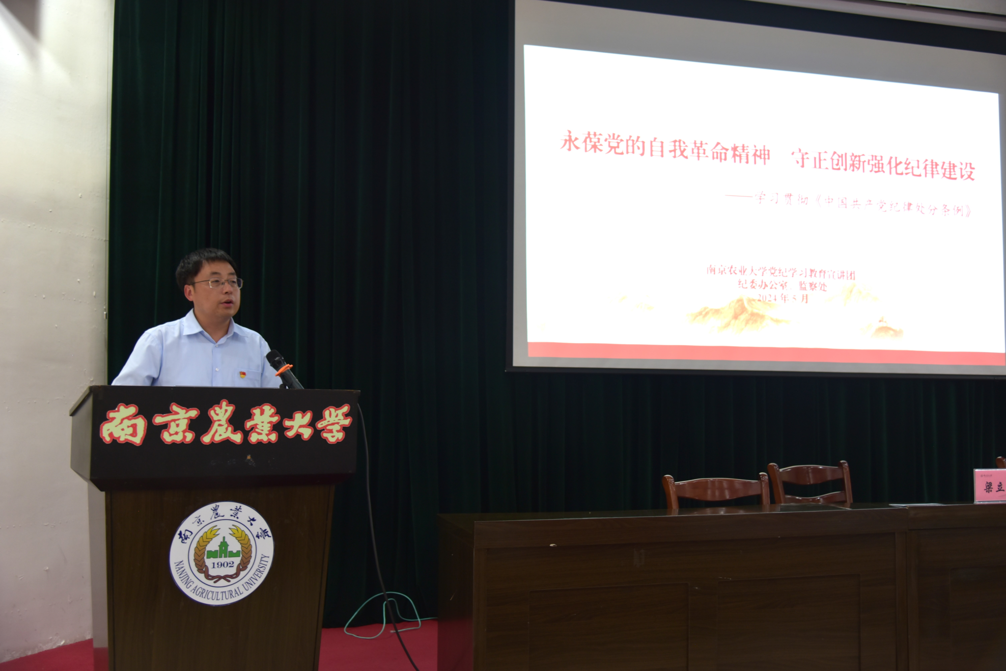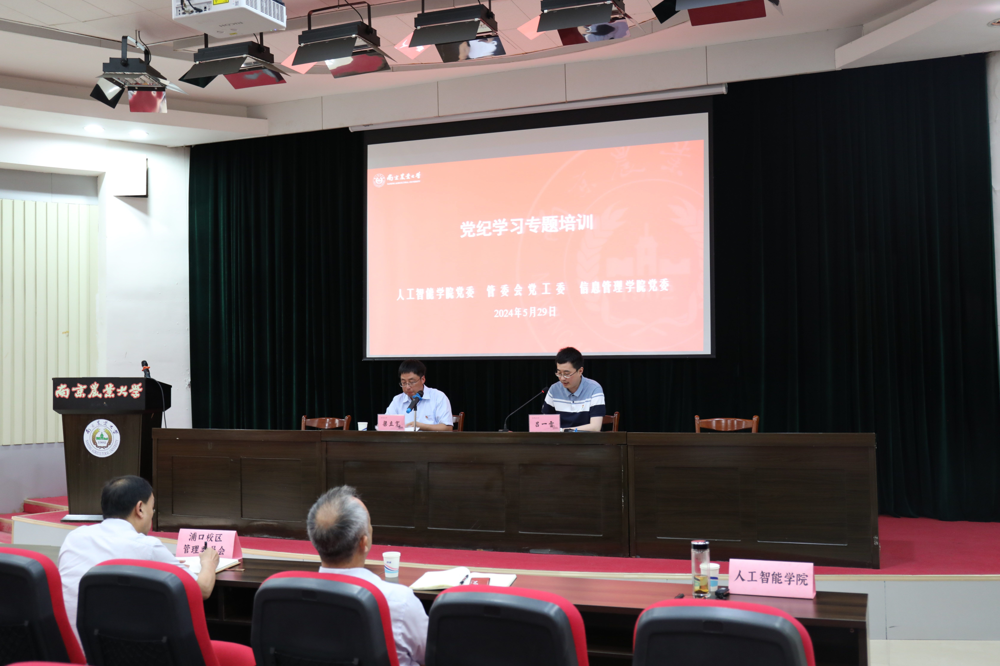 党委与浦口校区管委会党工委、人工智能学院党委联合举办党纪学习专题培训,校监察处副处长(主持工作)、纪委办公室副主任(监督检查室主任)梁立宽应邀作专题辅导报告。三家单位领导班子成员、教职工党员参加培训。