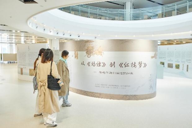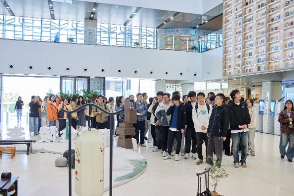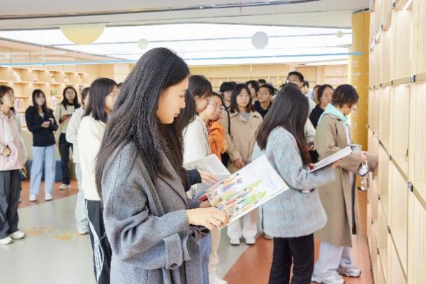 师生在巨型书墙前驻足观看