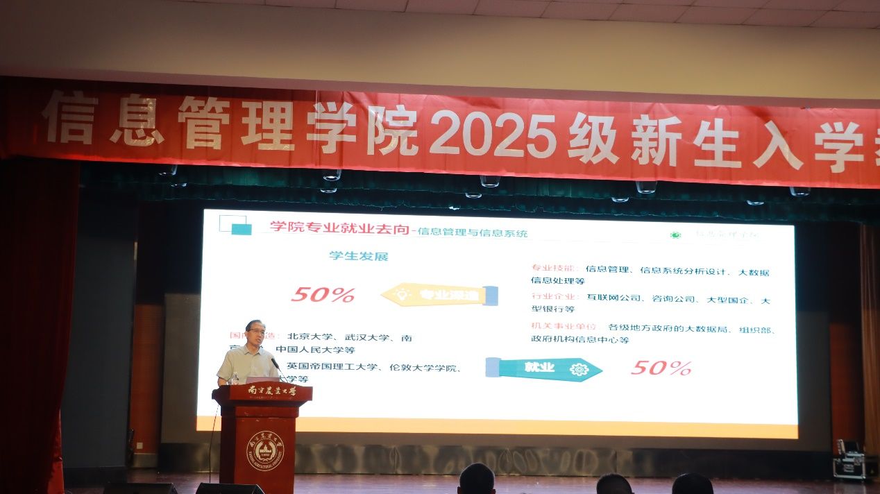 院长张兆同做院史院情介绍,以“学院发展与新生成长”为核心,深情回顾学院的历史沿革,全面介绍师资队伍的专业实力与学科建设的突出优势。他勉励新生们珍惜大学时光,将个人理想融入国家发展,在信息管理领域书写青春篇章。