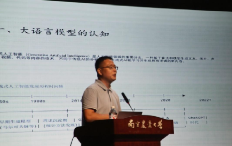 在第二阶段,王东波教授为新生带来了“人工智能发展和趋势”专题报告。他从大语言模型的认知与实践等方面展开,结合信息管理专业特点,分析了人工智能与本专业融合的前景,为新生们拓宽了专业视野,激发了他们对专业学习的兴趣。