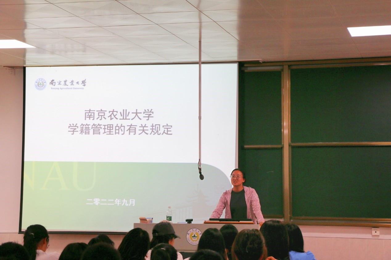辅导员夏丽君、秦可蓉、姜晓玥为22级新生们讲解学生手册。