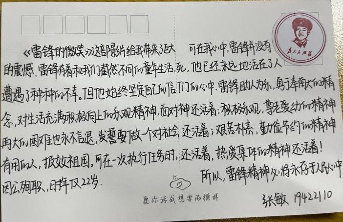 正如张敏同学所说的,雷锋助人为乐,用于奉献的精神还活着;积极乐观,尊老爱幼的精神还活着;艰苦朴素,勤俭节约的精神还活着;热爱集体的精神还活着。斯人虽远去,精神永长存,吾辈青年应当践行奉献精神、投身民族复兴,自觉服务社会,服务人民。