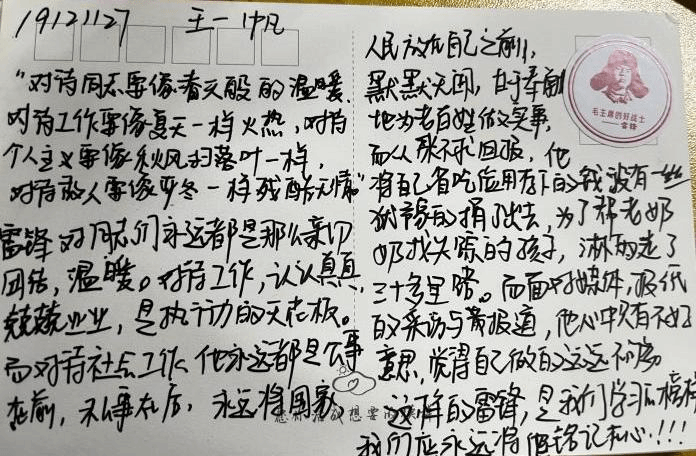 王一帆同学写道:“对待同志要像春天般的温暖,对待工作要像夏天一样火热,对待个人主义要像秋风扫落叶一样,对待敌人要像严冬一样残酷无情。”雷锋精神的本质不就是这种热爱祖国,把国家和人民的利益放在第一位,只讲奉献,不讲索取,全心全意为人民服务的奉献精神。