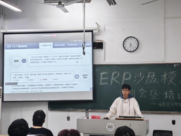 朱国宗老师系统阐释了ERP系统的核心理念及其在企业中的实际应用,为参赛同学建立了清晰的思维框架,更为即将到来的比赛指明了关键的思考方向。陈相旭同学从实战角度出发,详细解析了大赛笔试环节的准备策略与答题技巧,帮助同学们更有针对性地备战。高志航同学系统介绍了ERP系统的基本规则、操作流程及运营思路,让同学们能快速找到应用系统的核心方法,备赛方向更明确。